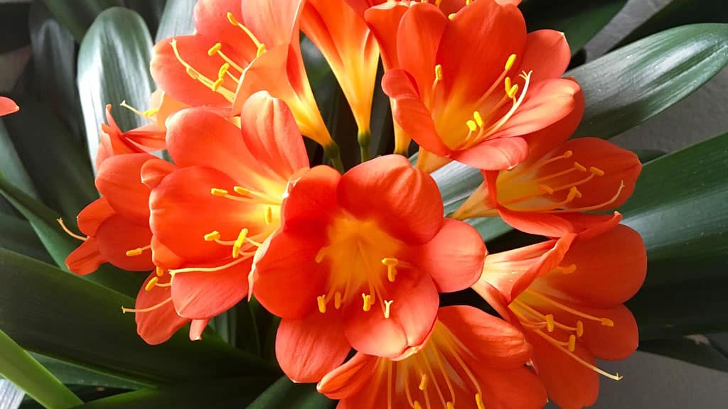 Clivia. Gehört zur gleichen Amaryllis-Familie wie die ersten beiden Pflanzen. Besticht durch ihre ungewöhnliche fächerförmige Blattanordnung und den riesigen, schirmartigen Blütenstand mit 10 rot-orangefarbenen Knospen.