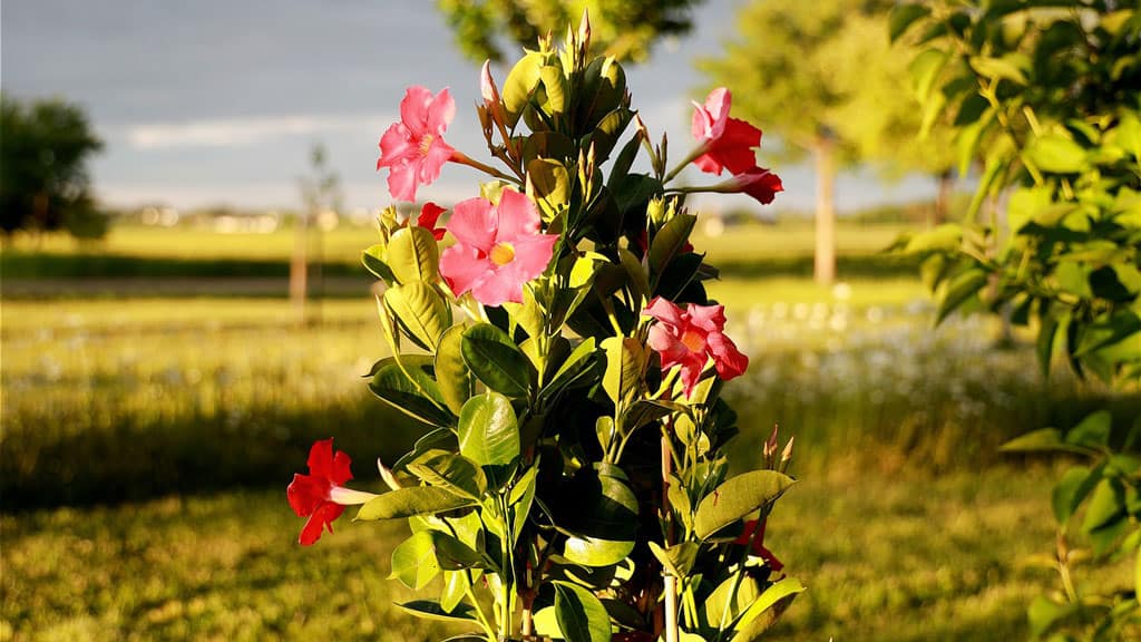 Dipladenia. Eine weitere duftende Liane, jedoch mit einem leichten, angenehmen Duft. Die Blätter sind glänzend grün. Die leuchtend gefärbten Knospen sehen auffällig und spektakulär aus, insbesondere die satten Rottöne, und halten bis zu 2 Wochen.