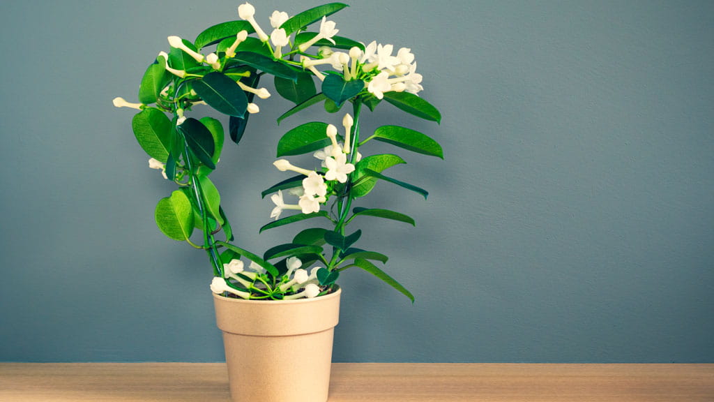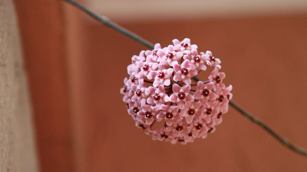 Hoya. Ihre Triebe sind etwas kürzer als die des Jasmins, und auch die Blüten sind kleiner, aber von origineller Form. Sie sehen aus wie weiße Sterne mit burgunderfarbenen Blütenblattbasen.