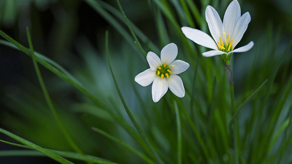 Zephyranthes, auch „Pop-up” genannt, weil es nur einen Tag dauert, bis der Blütenstiel vom Keimen bis zum Knospen wächst. Seine Blätter sind sehr dünn und ähneln den Federn einer Zwiebel. Die Blüten sehen aus wie kleine Lilien oder Sterne in weißer oder rosa Farbe.