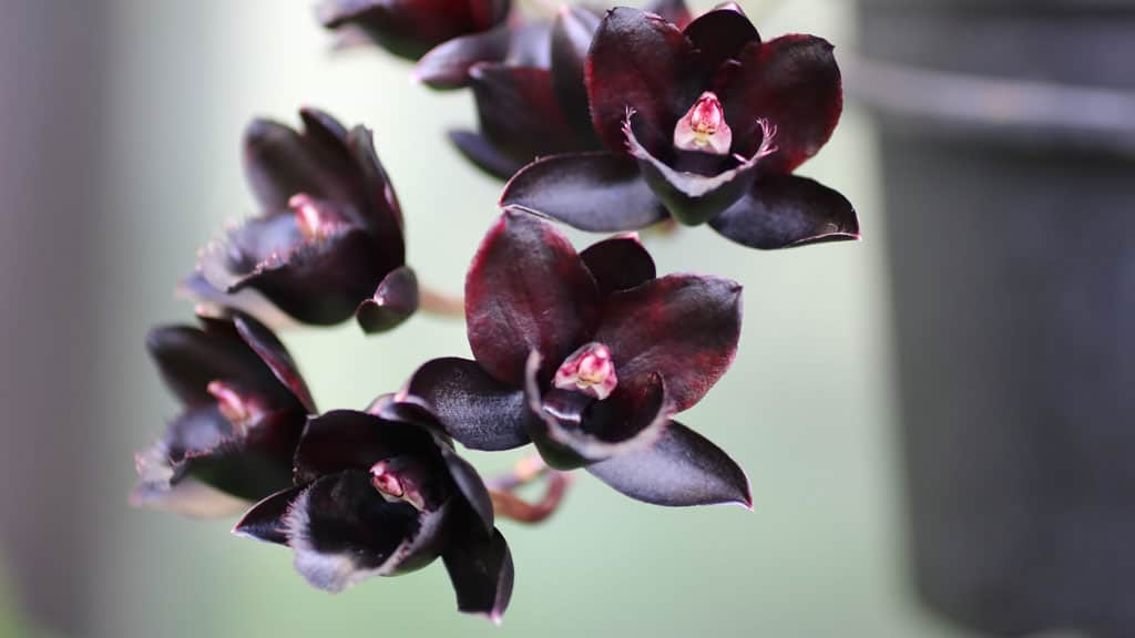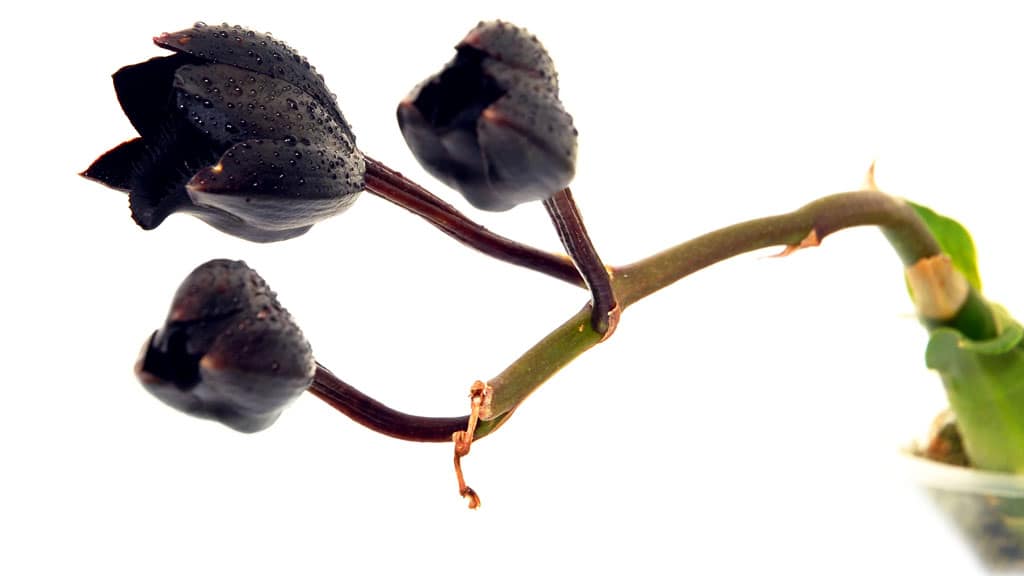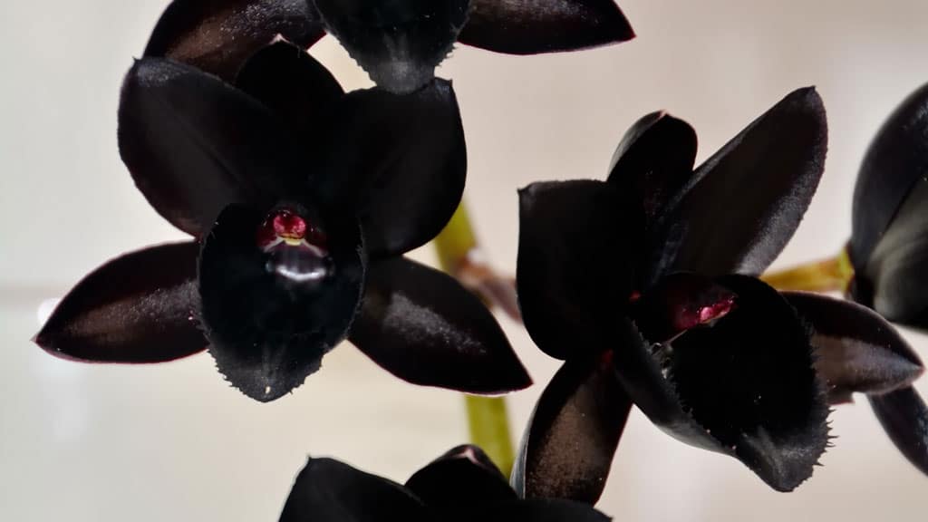 The orchid Fredclarkeara After Dark ‘Black Pearl’, often called ‘Black Pearl’, is the first human-made orchid with almost pure black color. It is famous for its incredibly dark flowers that emit a spicy-sweet fragrance. Although the flowers look black, they are actually a very dark red color.