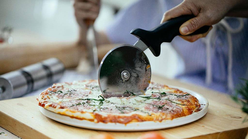 Pizza knife – a cutter with a round blade with a diameter of 8 cm. It is made of stainless steel. Flat, has a double-sided symmetrical sharpening along the entire cutting edge. The handle is attached from above and does not interfere with the free movement of the blade. Even with light pressure, it can handle the structure of crispy dough and generous filling.