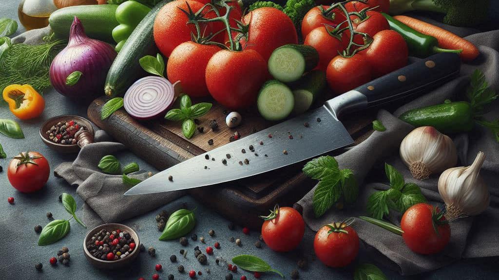 Kitchen knives for vegetables are characterised by a short, thin blade of up to 10 cm and a robust handle of 11 cm or more. The angle of their tip is sharper to easily peel tomatoes, peel aubergines, courgettes, make holes in pumpkins, remove potato “eyes”. There are also models with a hook-shaped blade in the form of a claw and those that resemble a santoku. Knives with a serrated blade can easily cut through the hard skins of foods.